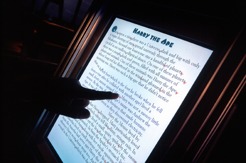 The Story of Harry the Ape starts as a simple one paragraph tale, but when the visitor touches the story, it starts growing and bends into an elaborate tale about far flung planets and fleas named Mary and mice and tiny micro-organisms whose lives revolve around Harry. The exhibit uses Fluid Technology developed by researchers at Xerox PARC. |