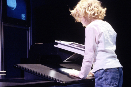Where is the secret treasure map? What's inside that suitcase? Visitors use the Glyph-O-Scope to reveal surprising information contained in ordinary-looking photos. Pictures of the pyramids under the Glyph-O-Scope reveal aliens marching around and a glimpse into the suitcase reveals -- a fish! Glyphs are modified halftone dots in pictures that are used to encode binary information. |