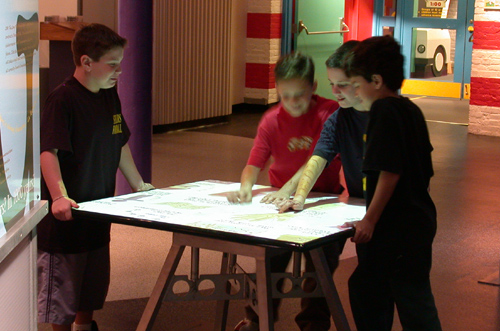 Tilty Tables look like games, and delighted teams of visitors immediately spring to investigate the moving shapes and work together to manipulate them. But then, they are drawn into the words. Pretty soon they are reading and exploring, whether it be a map, or folk tale, or language maze, or satellite images. They learn not just with their eyes, but with their hands and bodies. |